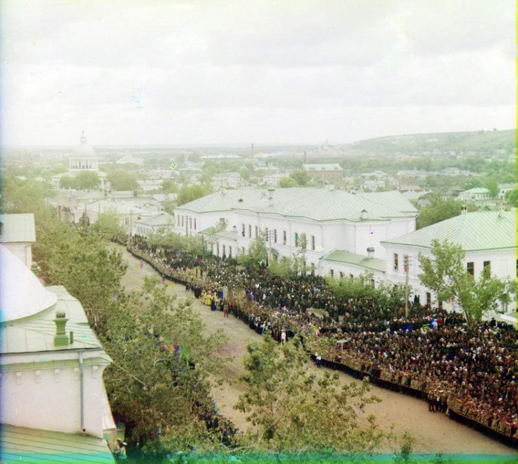 Вид с колокольни Белгородского Свято–Троицкого мужского монастыря на Соборную площадь во время торжеств прославления святителя Иоасафа Белгородского 4 сентября 1911 г. Справа — духовное училище (1807). На заднем плане — женский Рождество–Богородицкий монастырь.